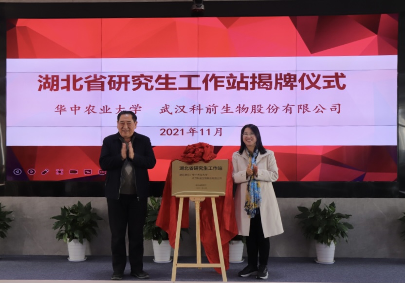 11月18日上午,华中农业大学动科动医学院党委书记刘兴斌、院长赵书红率领院领导班子全体成员莅临科前生物考察交流。公司董事长陈焕春院士、副董事长金梅林教授及全体在汉高管、博士热情接待了刘兴斌书记、赵书红院长一行。校企双方就进一步深化校企共同体建设、共促产学研融合发展进行研讨。陈焕春院士、赵书红院长为湖北省研究生工作站揭牌。