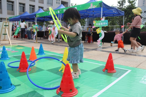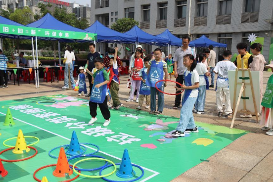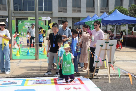 接下来的环保互动挑战游戏环节把活动推向了高潮。垃圾分类套圈圈、垃圾分类飞行棋、垃圾分类大比拼三个项目不仅让孩子们玩得尽兴,也增强了亲子之间的互动和配合。