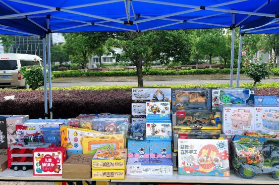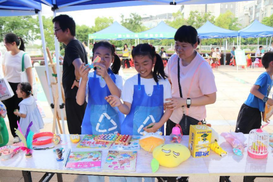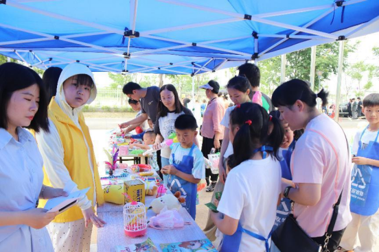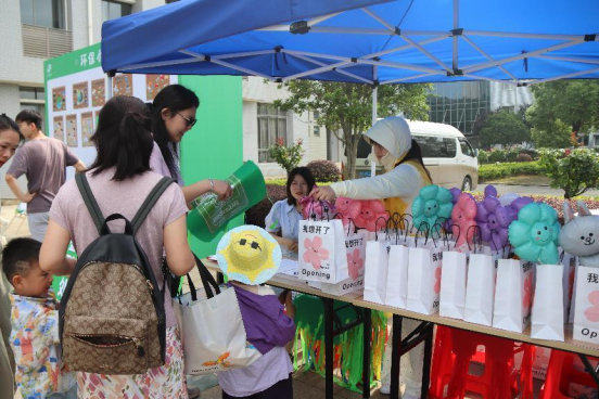 最后是“旧+旧=新”环保市集活动。在这个环节中,每组家庭提前准备了闲置的书本、玩具、生活用品等物品放置到我们的环保市集上。通过这个环节,“旧物”变“新欢”。从“物物交换”的概念出发,以闲置物品的免费交换,促进了大朋友与小朋友之间的互动。